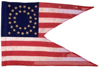 This silk, swallowtail guidon in the “stars and stripes” pattern as prescribed in General Order No. 4, dated January 18, 1862, includes 35 gold-painted stars in the canton. The inner circle contains 12 stars, the outer circle includes 19 stars, and each corner includes a single star.