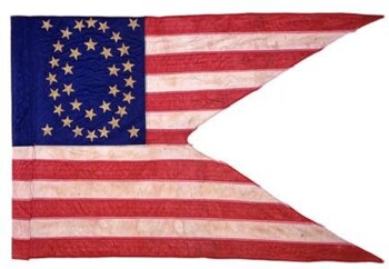 The NYS Battle Flag Collection includes two silk, swallowtail guidons attributed to Battery A, 3rd Artillery (Light), NY Volunteers. Each guidon, in the “stars and stripes” pattern as prescribed in General Order No. 4, dated January 18, 1862, includes 34 painted stars in the canton in an elliptical pattern with 10 stars in the inner oval, 20 stars in the outer oval, and one star in each of the canton's four corners.