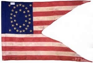 These two silk swallowtail guidons conform to the “stars and stripes” pattern prescribed in General Order No. 4, dated January 18, 1862. Both flags were sewn between two layers of nylon netting in the mid-1970s matching the colors of the flag with different colors of net. The lighter areas of netting show areas of loss in the original flag.