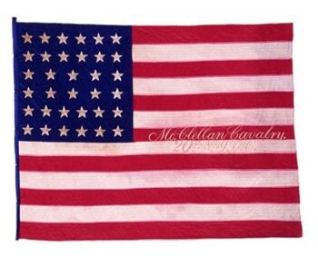 The 20th Regiment Cavalry, or “McClellan Cavalry,” organized at Sackett’s Harbor and mustered into service for three years in September 1863 under Colonel Newton Lord. This embroidered national flag, pieced together using 1/8" flat-felled seams, includes 34 cream-colored stars and inscription, "McClellan Cavalry, 20th N.Y.V.C." The regiment deposited this flag into the state flag collection on August 23, 1865.