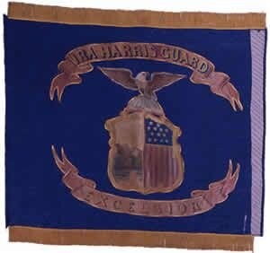 In November 1861, Miss Mary Blake presented this embroidered silk regimental flag to the 5th Cavalry at Camp Scott, Staten Island. Senator Ira Harris gave the presentation address. The inscriptions are highlighted with darker coloring, and the unit’s nickname appears in the upper ribbon rather than the regiment’s numeric designation. The fly end of this flag is missing, so the netting that extends the width of the extant flag is an estimate.