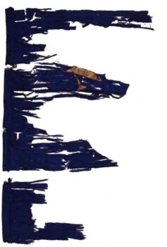 This blue, silk flank marker carried by the 6th Regiment Cavalry has significant losses. Based upon comparisons to similar flags, this marker featured painted inscriptions, "N.Y.S.V." and 'CAVALRY." in addition to a red, oval shield painted in the center.