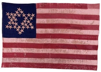 Made by women from Hempstead, Long Island and reportedly received by Company H in the fall of 1862 while on duty near Washington, D.C., this silk national color includes 34 appliquéd stars in the canton. The stars are arranged in a star pattern sometimes referred to as the "Great Luminary Pattern." In the late 1930's the flag was "restored" by Mrs. Katherine Fowler Richie using a technique patented by her mother Mrs. Amelia Fowler, the woman who treated the Star Spangled Banner.