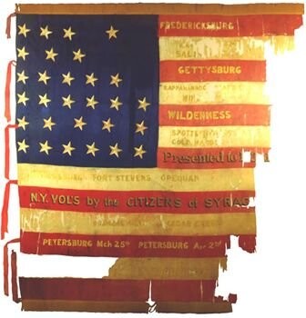 This silk national color carried by the 122nd New York Volunteers features 29 of the original 34 stars, 3-inch bullion fringe, painted battle honors, and a painted inscription which identifies the flag as having been presented to the regiment by the citizens of Syracuse.