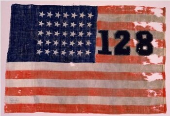 The New York State Battle Flag Collection includes two printed wool camp colors carried by the 128th Regiment NY Volunteer Infantry. Each camp color, manufactured by James Toft of New York City, is in the U.S. national pattern as prescribed in General Order No. 4, Headquarters of the U.S. Army, dated 18 January 1862. Each flag includes 35 white stars in 5 horizontal rows and “128” appliquéd in dark wool fabric. After the regiment received the flags, someone added the "128" unit designation. One flag includes "128" on the front or obverse, while the other flag includes "128" on the back or reverse. When originally constructed, the wool was rolled along the hoist edge and stitched to form a staff sleeve. The staff sleeve on each camp color seen here is no longer stitched to form a sleeve. The fly measurements include the open sleeve.