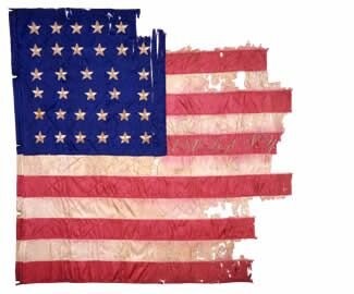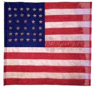 These silk flank markers, reportedly manufactured by Tiffany & Company, were presented to the 131st Regiment NY Volunteer Infantry by Horace Day at Annapolis, Maryland, in the fall of 1862. Pieced together with red, white, and blue silk in the U.S. national pattern (34 stars) with hand-sewn, 1/8-inch, French seams, each flag in the pair features the regiment’s designation embroidered in the center red stripe. One of the flags received a netting treatment in 1971. Not a recommended treatment by today’s standards, the netting obscures construction details, creates a stiffer hand, a false sense of fabric stability, and adds stress holes in the delicate silk.