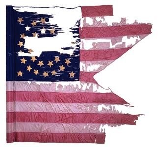 The NYS Battle Flag Collection includes two guidons carried by the 144th Regiment New York Volunteer Infantry. Each silk swallowtail guidon conforms to the “stars and stripes” pattern prescribed in General Order No. 4, dated January 18, 1862. Both guidons have losses, most notably to the canton and fly.