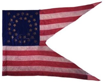 The NYS Battle Flag Collection includes two silk swallowtail guidons carried by the 147th Regiment New York Volunteer Infantry. Each guidon conforms to the “stars and stripes” pattern prescribed in General Order No. 4, dated January 18, 1862. The cantons include bronze-colored, painted stars in the typical, concentric circles pattern. Each guidon originally included 35 stars. The regiment mustered out in June 1865 and turned the guidons over to New York State's Adjutant General who then deposited the flags in the Battle Flag Collection.