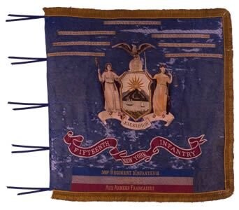 This blue silk Regimental Color includes seven battle streamers sewn above the embroidered Arms of the State of New York to honor the regiment's meritorious service in WW I. The 15th Regiment, designated the 369th Infantry by U.S. authorities, served under French command as indicated by the inscriptions in French along the red, white, and blue ribbons positioned on the lower portion of the flag.