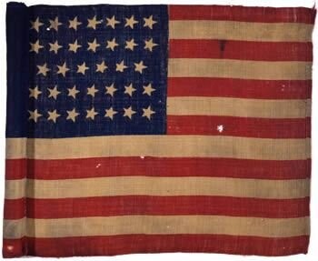 The New York State Battle Flag Collection includes 5 printed wool camp colors, including the flag seen here, carried by the 20th Regiment U.S. Colored Troops. The camp color is in the U.S. national pattern as prescribed in General Order No. 4, Headquarters of the U.S. Army, dated 18 January 1862. The flag includes 34 white stars in 5 horizontal rows (7-7-6-7-7) with the center row of 6 stars indented and the hoist edge folded over to create a sleeve for attachment to the staff.