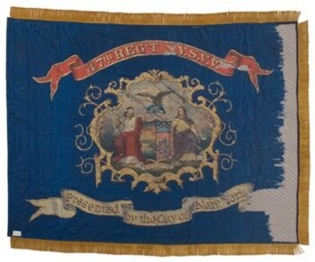 The 47th New York Volunteers, or "Washington Grays," mustered into service for three years on September 14, 1861. When their three-year term expired, those entitled were discharged and the regiment continued in service as "Veteran Volunteers" until mustered out in August 1865. The regiment most likely received this blue silk Regimental Color from the City of New York in April 1865 during the regiment's service as "Veteran Volunteers," as indicated by the "N.Y.S.V.V." painted in the flag's upper red ribbon. The painted flag includes the Arms of the State of New York on one side and the Arms of the City of New York on the other.
