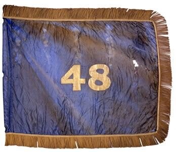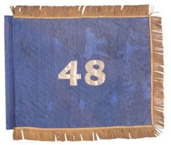 The two silk flank markers seen here feature the regiment's numeric designation painted in gold in the center and yellow-colored, twisted and looped fringe on three sides. Reportedly, the 48th Regiment NY Volunteer Infantry received these flags on January 12, 1862, at Hilton Head, South Carolina, from Adjutant Anthony Goodell on behalf of the ladies of Brooklyn. One of the two flank markers shows signs of light damage as evidenced by the diagonal brown markings and globular discoloration along the top edge. The regiment deposited the flank markers into the Battle Flag Collection via Adjutant General William Irvine on November 27, 1865.