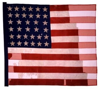 In early October 1861, “Perry’s Saints” arrived at Annapolis, Maryland, the capital city in a vital border state where citizens supported both the Union and the Confederacy. The regiment received this silk national color on October 16, 1861, at St. John’s College in Annapolis from Maryland Governor Thomas Hicks as part of a larger flag presentation ceremony for each regiment in Brigadier General Egbert Viele’s brigade. The presentation ceremony and the flag itself, a joint gift from the “amiable lady of the General” and the Union Defense Committee of New York City, afforded Hicks the political opportunity to publicly affirm his devotion to the Union. The flag accompanied the regiment on campaign, including during the deadly assault on Fort Wagner, South Carolina, July 18, 1863. During the assault, the regiment suffered over 200 casualties; at least two color bearers were killed in action, Corporal Alonzo Hilleker and Corporal Sidney Wadhanis. This silk national color received a netting treatment in 1975. At that time a restorer sandwiched the flag between color-matched nylon net and secured the net to the flag with closely spaced rows of machine zigzag stitching. Although the netting treatment has kept the flag together, when State Parks conservators examined the flag in early 2013, they realized that the many rows of stitching carried out in 1975 created additional breaks and losses in the flag. The conservators did not remove the netting treatment because the many rows of stitching used to apply the net weakened the original silk fabric.