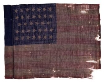 This printed wool camp color in the U.S. National pattern conforms to General Order No. 4, Headquarters of the U.S. Army, dated 18 January 1862. The stars are arranged in five horizontal rows with seven stars in each of the upper two and bottom two rows while the indented middle row includes only six stars. When constructed, the wool was rolled along the hoist edge and stitched to form a staff sleeve.