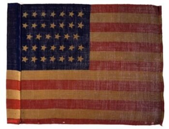 This printed wool camp color in the U.S. National pattern conforms to General Order No. 4, Headquarters of the U.S. Army, dated 18 January 1862. The stars are arranged in five horizontal rows with seven stars in each of the upper two and bottom two rows while the indented middle row includes only six stars. When constructed, the wool was rolled along the hoist edge and stitched to form a staff sleeve.