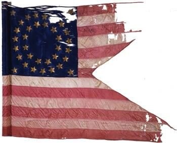This silk swallowtail guidon, used as a marker to assist in battlefield maneuvers, conforms to the “stars and stripes” pattern described in General Order No. 4, Headquarters of the U.S. Army, dated January 18, 1862. This silk flag has retained the original dark blue hue in the canton. The center fly includes reinforcement stitches for added strength. The damage and loss in the top half and tails were most likely caused from use, leaving the flag in a fragile state.