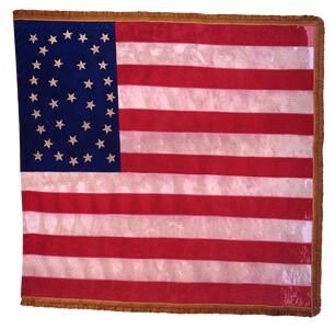 This flag carried by the 73rd New York Volunteers, or “Fourth Excelsior,” includes 34 gold-painted stars in a pattern typically found on national colors from the Schuylkill Arsenal in Philadelphia, Pennsylvania. Organized July-October 1861 in New York City’s Bowery neighborhood, the regiment included recruits from among the city’s volunteer firemen to earn the moniker, “Second Fire Zouaves,” in deference to Colonel Elmer Ellsworth’s original “Fire Zouaves” regiment formed in April 1861. Mustered out on June 29, 1865, the regiment deposited this flag with state authorities in August 1865.