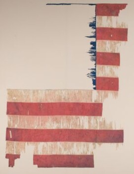 On November 21, 1861, the 75th Regiment New York Volunteers, or “Auburn Regiment” after the regiment’s home city of Auburn, New York, received a stand of colors, including the national color seen here, from two patriotic Auburn ladies, Miss Sarah Dill and Miss Helen Bartlett. Reportedly, Dill made one flag in the stand of colors, presumably this national color. This flag accompanied the 75th New York Volunteers during the dramatic Siege of Port Hudson, Louisiana, May 23 – July 8, 1863. The regiment suffered over 100 casualties during the siege, including the gallant color bearer who carried this national color. The color bearer, possibly Sergeant Lyman Hill, received a fatal bullet to the heart and as he fell a corporal snatched the national color and waved the flag in the face of the enemy. In early 1864, veterans from the regiment briefly returned home to Auburn with the tattered, war-torn national color. Although significantly damaged, the once pristine flag returned home with honor. The flag entered the New York State Battle Flag Collection by 1865 and remained furled upon its staff until 2016. Although only approximately 35% of the flag currently remains, the banner serves as a tangible emblem of the regiment’s sacrifices.