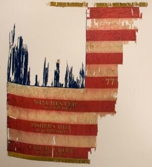 On November 28, 1861, the 77th New York Volunteers assembled outside the Temple Grove Seminary in Saratoga Springs, New York, where the school's proprietor, Reverend Luther F. Beecher, presented this silk national color to the regiment on behalf of his female students. The regiment carried this flag into battle for three years, including on May 3, 1863, at Marye's Heights, Virginia, where an artillery shell pierced the blue canton. Two of the flag's color bearers received mortal wounds while in battle - Corporal Joseph Murrer at Antietam, Maryland, September 17, 1862, and Corporal Michael McWilliams at the Wilderness, Virginia, May 6, 1864. The regiment retired the war torn color in November 1864 and added battle honors, in paint, to commemorate their service at three recent battles in Virginia - Winchester, September 19, Fisher's Hill, September 22, and Cedar Creek, October 19.