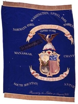 On December 15, 1862, as the 80th New York Volunteers or 20th New York State Militia skirmished below Fredericksburg, Virginia, ladies from Saugerties presented the Regimental Color seen here to the regiment in a public ceremony at the Reform Dutch Church in Saugerties. The flag, manufactured by Tiffany & Co. for $ 200.00, finally reached the regiment in February 1863 while they were on provost duty near Aquia Creek, Virginia. The regiment carried the embroidered color on campaign, including at Gettysburg where Color Sergeant Edward Beckett suffered a hand wound as enemy fire shattered the staff. The bullet-riddled flag includes the Arms of the State of New York embroidered in the center and the inscription, "Presented by the Ladies of Saugerties, N.Y." embroidered along the lower edge. Originally the flag included seven battle honors commemorating the unit's service from April 1861-except Fredericksburg. The regiment later added a black paper battle honor with gilt lettering for Fredericksburg and a similar honor on the reverse for Gettysburg.