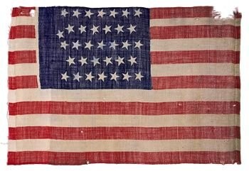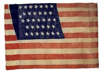 Printed wool camp colors in the US national pattern as prescribed in General Order No. 4, Headquarters of the U.S. Army, dated 18 January 1862. These early-war camp colors include 34 white stars in five horizontal rows. When constructed, the wool was rolled along the hoist edge and stitched to form a staff sleeve. The staff sleeve on both camp colors seen here is no longer stitched. The fly measurements include the open sleeve.