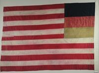 This silk national color carried by the 8th Regiment NY Volunteer Infantry includes 34 embroidered stars arranged in a star pattern in the canton. The canton on the opposite side includes the German tricolor, three horizontal silk bands of black, red, and gold. The regiment, composed mostly of Germans, received this flag in May 1861 from Amalie Struve on behalf of the German ladies of the City of New York.