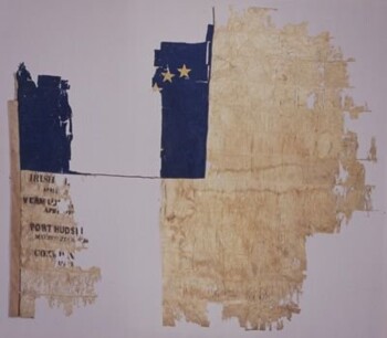 On December 21, 1861, as the 91st New York Volunteers prepared to leave Albany, New York, for the seat of war, the regiment assembled outside Alderman John W. Harcourt’s residence on Lydius Street where Mrs. Harcourt presented the home town regiment with this national color. During the first assault at Port Hudson, Louisiana, May 27, 1863, enemy fire reportedly tore the flag and severed the top of its staff. Corporal Patrick Garrity retrieved the fragment and gave the severed top to the colonel who delivered it to Mrs. Harcourt. During the second assault on Port Hudson, June 14, 1863, color bearer Private Samuel Townsend, a former Confederate soldier, received several gunshot wounds, including one reportedly from his brother, a soldier with an Alabama regiment. Townsend succumbed to his wounds and died on August 1, 1863. In July 1864, when the regiment returned home on furlough, the veterans presented the damaged flag and its staff to Mrs. Harcourt who turned the flag over to state authorities soon thereafter. The battle-damaged flag also suffered over the last century and a half. Its red silk stripes have significantly faded from overexposure to light, and the silk and the painted stars and battle honors are splitting and broken from furled storage in a dry environment.