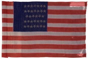 The 98th Regiment, under Colonel William Dutton, organized at Albany in February 1862 when two incomplete units, the Lyons and Malone regiments, consolidated. This printed wool camp color in the US National pattern conforms to General Order No. 4, Headquarters of the U.S. Army, dated 18 January 1862. The stars are arranged in five horizontal rows with seven stars in each of the upper two and bottom two rows while the indented middle row includes only six stars. The hoist edge was rolled over and seamed to form a staff sleeve. The flag was stitched between two layers of nylon net in 1972. When the flag was manufactured the printing was applied to a roll of wool fabric. This flag was improperly cut at the time of manufacture. An extra 4-inches of wool fabric was mistakenly included along the hoist edge.