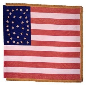 The national color seen here, carried by the Excelsior Brigade during the 1862 Virginia campaigns and reportedly made by Evans & Hassall in Philadelphia, Pennsylvania, includes 34 gold-painted stars arranged in concentric ovals, a pattern typically found on national colors from Philadelphia’s Schuylkill Arsenal. Brigadier General Joseph Revere, a former Navy midshipman, Mexican War veteran, and grandson of Paul Revere, first took command of the Excelsior Brigade in December 1862 and supposedly inherited the flag from the previous commander, Colonel George Hall. Augustus L. Revere, General Revere’s son, presented the flag to state authorities after the war.