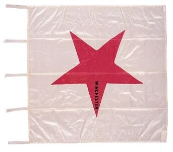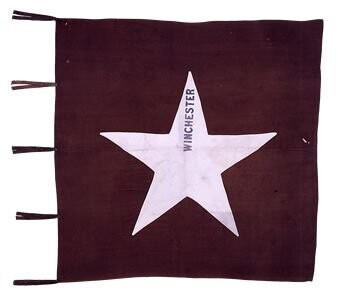 The New York State Battle Flag Collection includes four U.S. Signal Corps Battle Flags attributed to first lieutenant, later captain, David A. Taylor for conspicuous service at the Battle of Winchester, Virginia, March 23, 1862. (This webpage shows two of the four flags.) During the battle, Taylor and his Flagman, Oliver Temple, successfully operated one of six signal stations. Later, Taylor and Temple accompanied the Union advance and, while under heavy enemy fire, Taylor had a button shot off his overcoat and Temple suffered an arm wound. In accordance with General Orders previously issued by Chief Signal Officer Major Albert J. Myer on March 19, 1862, Taylor was eligible to place upon his service flags a star and to carry a flag, with a star, at ceremonial occasions. Each flag's star should include the name of the battle in which the star was earned in the star's upper point. The white flag seen on this page is silk and is believed to be the ceremonial flag, whereas the other flag, made of cotton, is believed to be one of Taylor's service flags. Interestingly, the star on the white silk flag is pointed down while the star on the other flag is pointed up. In addition, "WINCHESTER" is appliquéd on the white silk flag whereas the word "WINCHESTER" is printed on the other flag. The measurements exclude the ties.
