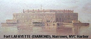 (2): 1812, New York Harbor off Fort Hamilton. Built in 1812-18 on Hendrick's Reef and armed with 72 cannon. Originally named Fort Diamond, renamed in 1825 for General Lafayette. Used for Confederate prisoners 1861-66. Burned in 1868. Transferred to the Navy in 1898 for the storage of Naval supplies and ammunition. During WW2 the fort was used as an interim storage facility and transfer point for small and miscellaneous lots of ammunition. Fort included a Marine Barracks. Transferred to NYC after the war in 1948, mostly demolished in 1960 for Verrazano-Narrows Bridge foundations.