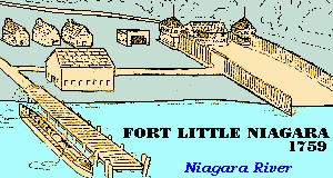 Description: Fort Little Niagara: 1750, Niagara County, Niagara Falls. A small blockhouse and storehouse was first errected in 1745 at a location known as "Frenchman's Landing." In 1751 the upper end of the portage from Fort Niagara was moved a few hundred yards South and Fort Little Niagara or Fort du Portage was constructed. Consisted of three good sized blockhouses with palisades between them and the river. Destroyed when abandoned in 1759 at the approach of the English. Rebuilt by British as Fort Schlosser in 1760.