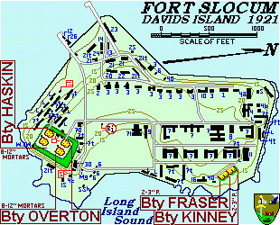 Located offshore from New Rochelle. Originally built as a military hospital complex and POW camp. Nearby Hart Island was also used. First fortified in 1878. Batteries here were an unnamed 1898 battery, Battery Haskin (1897 - 1919), Battery Overton (1897 - 1919) partially destroyed, Battery Practice (1896 - 1899) partially buried, Battery Kinney (1904 - 1917) destroyed, and Battery Fraser (1901 - 1917) destroyed. Became Slocum Air Force Base (NIKE Missile Base) from 1946 - 1950, and 1955 - 1965, and also used for the Armed Forces Information School, an Army Chaplain School, and a training and recruitment center (1919 - 1946). The island now sits abandoned and overgrown. A 15-inch Rodman cannon sits by the wharf.
