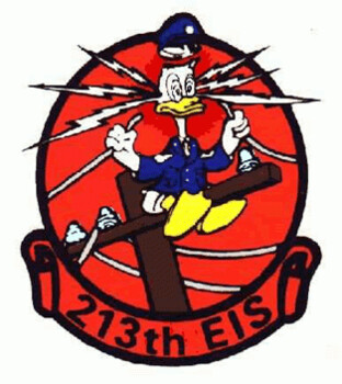 History - The 213th Engineering Installation Squadron has been at Roslyn since 1959, when it moved from a Brooklyn, NY Armory. Its mission install and maintain Radio, Central Office, and Wire communications Facilities. The 213th was federally recognized in 1948 as the 602nd Signal Construction Company, and became the 213th Communications Constructions Squadron, and a member of the Air Force Team in 1952. In January 1959 the unit was redesignated as the 213th Ground Electronics Engineering Installation Agency (GEEIA), and on 1 May 70, the 213th received its present designation as the 213th EI Squadron, a member of the Air Force Communications Service. Mission - The 213th Engineering Installation Squadron provides for the engineering, Installation, and removal, and relocation of ground communication-electronics systems, and to provide for emergency and programmed, mobile, on-site, maintenance and modification of these systems. The unit also responds to National Guard Bureau taskings. SIGNIFICANCE OF UNIT EMBLEM The unit emblem was desgined by Walt Disney in the mid fifties. The orange and blue signify the state colors. The blue and yellow (For Gold) signify the Air Force colors.; The orange and white signify the roots of communication that originated in the U.S. Army Signal Corps. The lightning bolts signify electronics, the open wire transmission lines signify the telephone and antenna communication mission. Donald in Air Force Blue signifies the presence of the unit on Long Island which is noted for their famous duck. Information submitted by MSgt Jan Klebukowski.