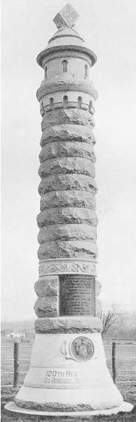 Front - 120TH NEW YORK INFANTRY, 2D BRIGADE, 2D DIVISION, 3D CORPS. THE ONE HUNDRED AND TWENTIETH NEW YORK INFANTRY HELD THIS PART OF THE LINE ON THE SECOND DAY OF JULY, 1863. PRESENT FOR DUTY; 30 OFFICERS, 397 MEN; TOTAL, 427. CASUALTIES : (FROM THE WAR DEPARTMENT) KILLED IN BATTLE, 8 OFFICERS, 25 MEN; WOUNDED, 10 OFFICERS, 144 MEN; MISSING, 17; TOTAL 204.